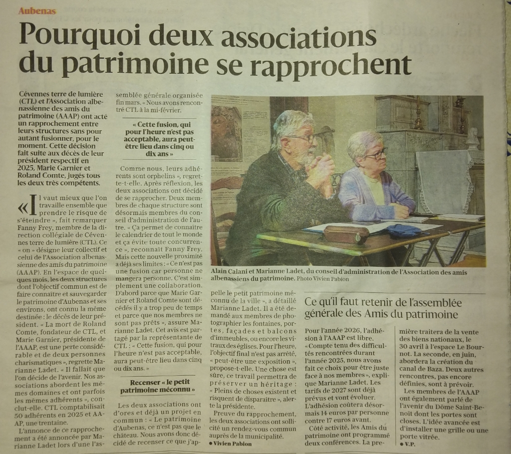- Projet de mutualisation de nos 2 associations albenassiennes : avec AAAP ? Comment ? sous quelle forme ? en collégiale ? à réfléchir. Une rencontre est prévue pour en discuter avant l’AG