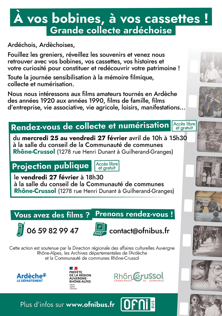 Ofnibus, association au service de la mémoire filmique des territoires, organise une projection publique le vendredi 27 février à 18h30 à la salle du conseil de la communauté de communes Rhône Crussol à Guilherand Grange.